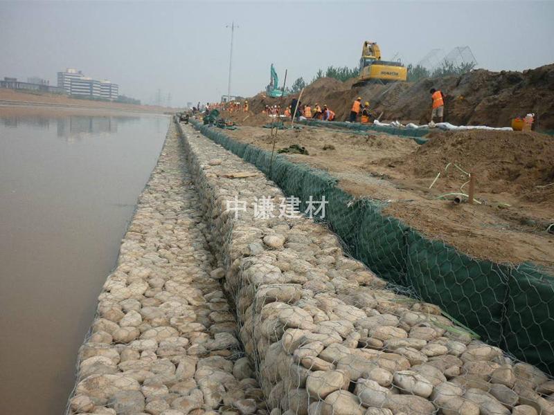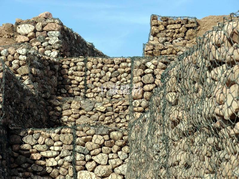 (4)鋅-5%鋁-混合稀土合金鋼絲包塑:在鋅-5%鋁-混合稀土合金鋼絲的表面包一層PVC或PE保護層,再編織成各種規(guī)格的石籠網(wǎng)。這層保護層將會大大增加在高污染環(huán)境中的保護,并且通過不同顏色的選擇,使其能和周圍環(huán)境融合。